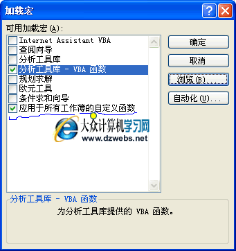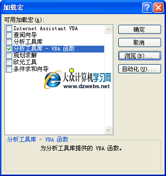 点击“浏览”按钮,找到上述操作保存的.xla文件,成功之后,会看到如下图的对话框。