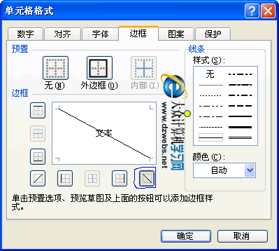 上图中,切换到“边框”选项卡,点击蓝线圈住的那按钮,让单元格从左顶位置到右下位置,产生一条对角线,之后点击“确定”按钮。