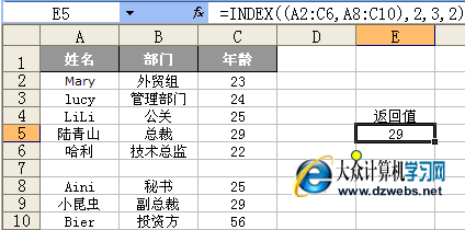 =INDEX((A2:C6,A8:C10),2,3,2),其中的3代表返回已选择的数据区域的第三列数据;