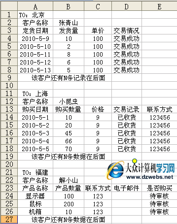 现在,我们来稍微总结一下:比如,TO:上海,也就是上海的这个客户,名称是小昆虫,下面的当然是他的客户信息了。我们要做的就是单独打印客户的信息,不能让多个客户信息打印到同一张纸上。