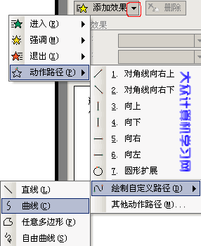 上图中,点击“添加效果”右边的小三角形,如上图,在弹出的菜单中选择“动作路径”→“绘制自定义路径”→“曲线”;