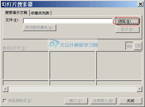 上图中,切换到“搜索演示文稿”,之后点击“浏览”按钮,并从文件搜索框中找到要插入到新演示文稿的原来的演示文稿!如下图!