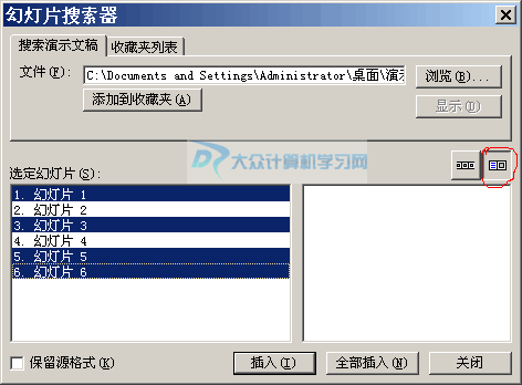 上图中,为保证幻灯片以列表方式显示,请先点击红线圈住的那按钮,之后,在列表中选择要插入的幻灯片,可以多选,也可以选择一个,或者全部选中!