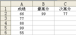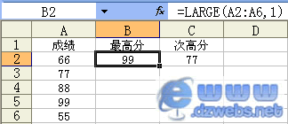 在B2单元格的FX函数输入框中输入:=LARGE(A2:A6,1) 按下回车键,这样就求得最高分了!