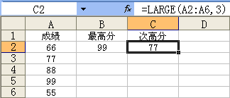 同样的道理,要想求取A列成绩中的第三个最高分,那么,应该输入:=LARGE(A2:A6,3) 看下图吧!
