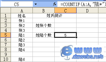 在上图中,我们选择C5单元格,之后在其对应的FX函数输入框中输入: =COUNTIF(A:A,“陆*“) 按下回车键,即可统计出姓陆的姓氏个数了。