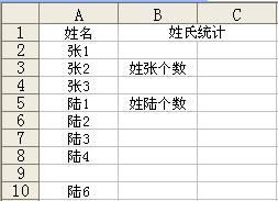 上图中,A列用来保存姓名,而B、C两列用来统计姓氏的个数。