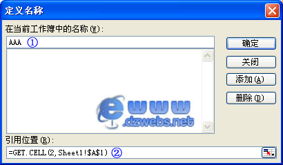 上图的对话框中,先在①位置此输入A1单元格的名称,如本例的AAA,然后,在②位置输入A2单元格的引用位置,如本例的“=GET.CELL(2,Sheet1!$A$1)”;