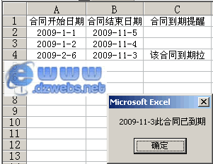 Private Sub Workbook_Open() For i = 2 To Sheet1.UsedRange.Rows.Count If (Sheet1.Cells(i, 2).Value = Date) Then Sheet1.Cells(i, 3).Value = "该合同到期拉" If (Day(Date) = Day(Sheet1.Cells(i, 2).Value)) Then MsgBox (Sheet1.Cells(i, 2).Value & "此合同已到期") End If Else Sheet1.Cells(i, 3).Value = "" End If Next i End Sub