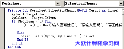 Private Sub Worksheet_SelectionChange(ByVal Target As Range) MyRow = Target.Row MyColumn = Target.Column If (MyColumn = 1) Then If (Trim(InputBox("输入密码验证", "请输入密码", "请在此输入密码")) =" www.dzwebs.net") Then Else Sheet1.Cells(MyRow, MyColumn + 1).Select End If End If End Sub