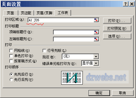 上图中,切换到“工作表”选项卡,注意,在“打印区域”的右边,有已经选择过的打印区域;就是它,导致不能打印全表而只能打印部分数据,现在,我们只要将那区域的单元格范围,如本例的A1:J26删除,最后点击“确定”按钮确认并退出即可解决您的问题。