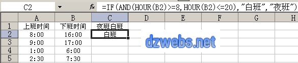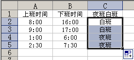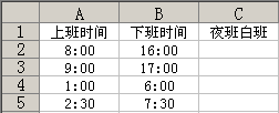 看上图,A列显示员工的上班时间,B列显示员工的下班时间,C列,用来显示对应的员工所上的班为白班或夜班,如何自动根据时间段,自动显示文字呢?