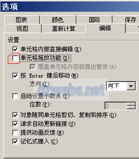 上图中,选择“编辑”选项卡,然后,在对话框中找到“设置”区域,找到“单元格拖放功能”,并在其前面使用鼠标左键点击一下,会打上一个√,最后,按“确定”按钮退出即可解决这样的问题。