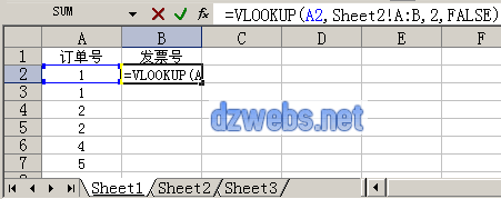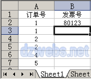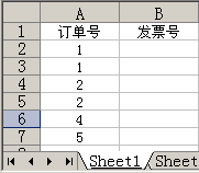 上表中,存在AB列数据,分别是订单号和发票号;一开始的时候,如上图,A列的订单号,号码有重复;而B列的发票号,则为空的,其值是通过比较,从表二Sheet2得来的!