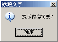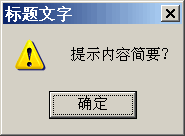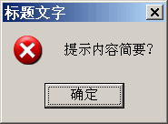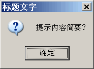 dim dffrim affrim = MsgBox("提示内容简要?", vbQuestion, "标题文字") '显示蓝色问号,作用:询问用户 affrim = MsgBox("提示内容简要?", vbInformation, "标题文字") '显示蓝色感叹号,作用:恭喜用户 affrim = MsgBox("提示内容简要?", vbExclamation, "标题文字") '显示黄色感叹号,作用:警告用户 affrim = MsgBox("提示内容简要?", vbCritical, "标题文字") '显示红色叉叉X,作用:提示用户操作有错误