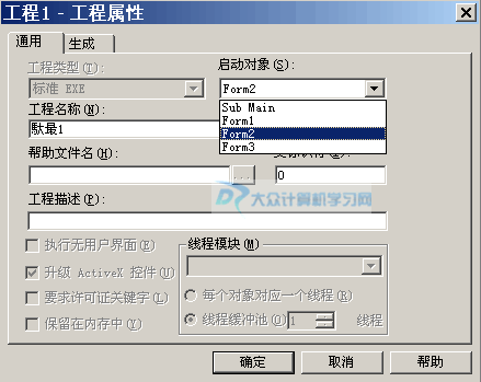 上图中,选择“通用”选项卡,之后在“启动对象”下面,通过下拉组合框选择一个窗体,就可以将其设置为工程运行时的默认启动窗体。