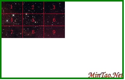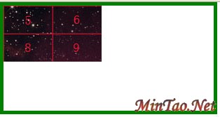注: 本文中使用的图片大小为 300px*120px,为了能很清晰的表达图形的哪部分被隐藏了,按照图片的大小平均分成了9等份。同时背景图片容器区域绘制出绿色边框清晰显示容器的范围。 1、background-position:0 0; 背景图片的左上角将与容器元素的左上角对齐。该设置与background-position:left top;或者background-position:0% 0%;设置的效果是一致的。例如: