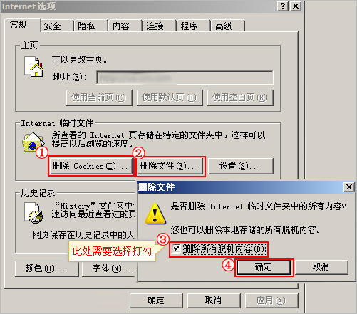 2、点“删除文件”,会自动弹出一个小窗口,将“删除所有脱机内容”前的框勾选,再确定;