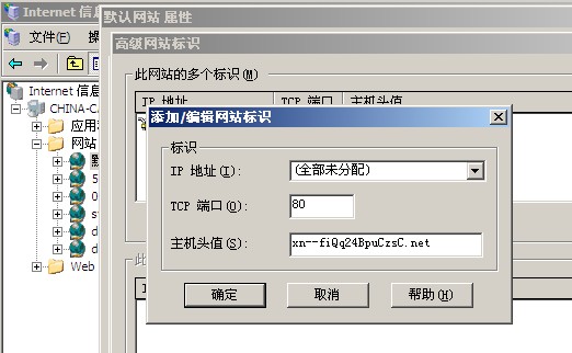 接下来要做的就是绑定域名注册。把转换后的结果复制,添加到IIS亿恩科技主机头值中。