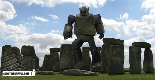 这组变形金刚的图片更不靠铺了,连英国的巨石阵都不放过。红牛版变形金刚还长出了翅膀,不知是何意思。