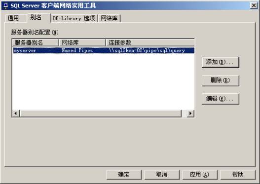 单击"别名"选项卡,还可以为服务器配置别名。服务器的别名是用来连接的名称,连接参数中的服务器是真正的服务器名称,两者可以相同或不同。如下图中,我们可以使用myserver来代替真正的服务器名称sql2kcn-02,并且使用网络库 Named Pipes。别名的设置与使用HOSTS文件有相似之处。
