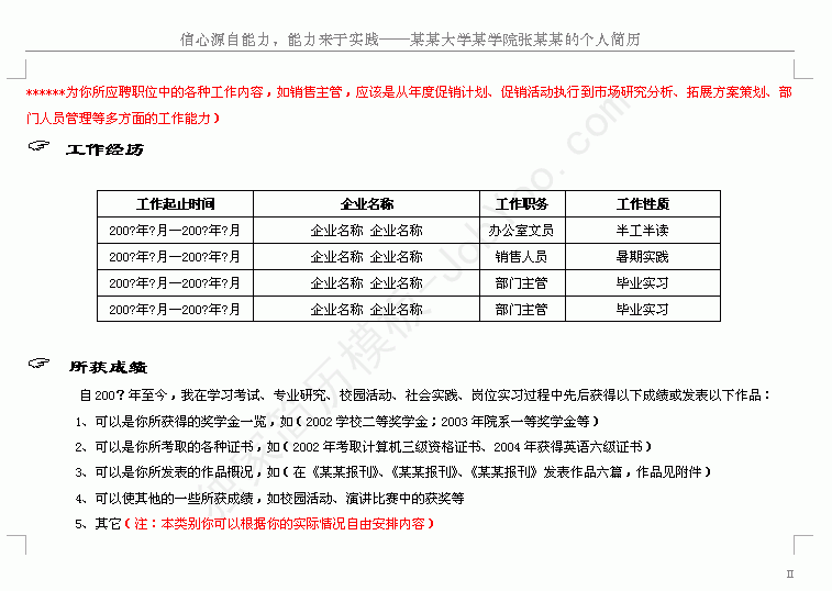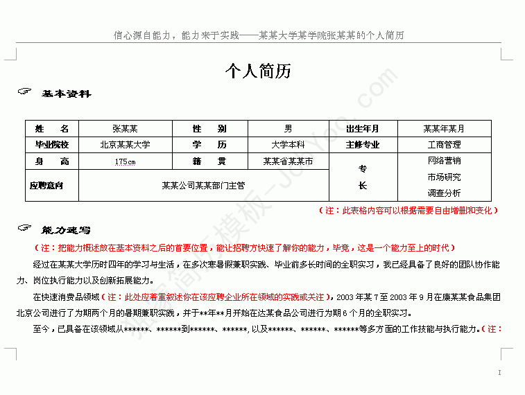 把能力概述放在基本资料之后的首要位置,能让招聘方快速了解你的能力,毕竟,这是一个能力至上的时代。能力速写范例: 经过在某某大学历时四年的学习与生活,在多次寒暑假兼职实践、毕业前多长时间的全职实习,我已经具备了良好的团队协作能力、岗位执行能力以及创新拓展能力。在快速消费品领域(注:此处应着重叙述你在该应聘企业所在领域的实践或关注),2003年某7至2003年9月在康某某食品集团北京公司进行了为期两个月的暑期兼职实践,并于**年**月开始在达某食品公司进行为期6个月的全职实习。至今,已具备在该领域从******、******到******、******,以及******、******、******等多方面的工作技能与执行能力。(注:******为你所应聘职位中的各种工作内容,如销售主管,应该是从年度促销计划、促销活动执行到市场研究分析、拓展方案策划、部门人员管理等多方面的工作能力)