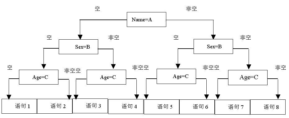 其中条件A、B、C之间是与的关系,A、B、C均为动态选择,可以取其中的一个、两个或三个,也可以一个都不选,当三个条件都不选择时则认为是无条件查询,按照通常的做法,判断方法如图2所示: