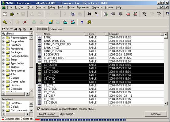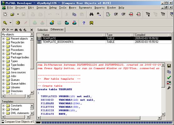 完成后会自动显示对象间的不同信息如下图所示,如果对比的对象DDL语句完全相同则不会显示列表。