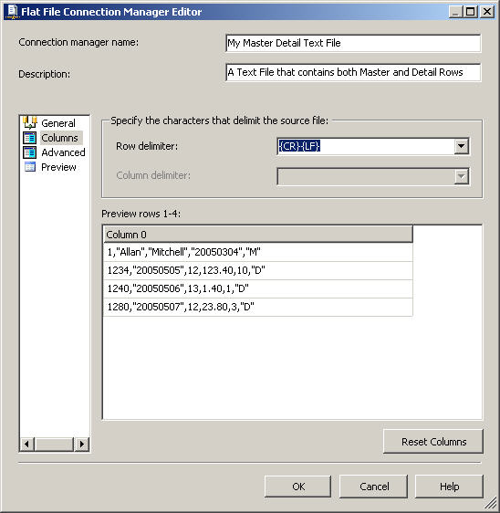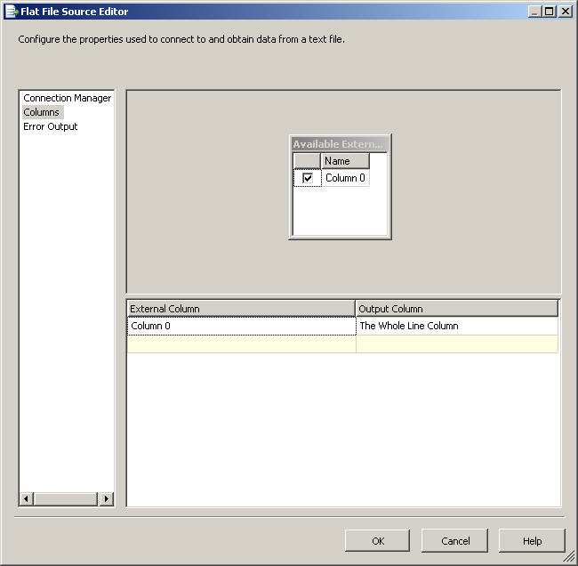 我们将建立一个flat file connection manager指向该文件,在这里,我并不打算把行拆分出来,暂时把整行读在一列中