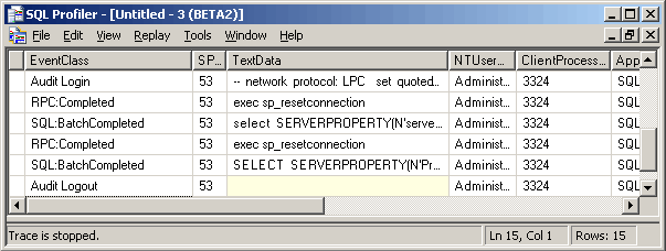 Imports Microsoft.SqlServer.Management.Smo Module SMOTest Sub Main() Dim svr As Server = New Server() Console.Writeline(svr.Name & " " & svr.Information.VersionString) End Sub End Module [C#] using System; using Microsoft.SqlServer.Management.Smo; namespace SMOTest { class Program { static void Main() { Server svr = new Server(); Console.WriteLine(svr.Name + " " + svr.Information.VersionString); } } } [VBScript] Set svr = CreateObject("SQLSMO.Server") WScript.Echo svr.Name & " " & svr.Information.VersionString Set svr = Nothing 当然,如果你的服务器不是缺省的,比如是用 服务器名/实例名组成,可以使用下面语句: Dim svr As Server = New Server("(local)") Server svr = new Server(@"(local)\INSTANCE01") 如果你想更复杂一点,也不想用WIN授权验证,可以参考下面代码 [Visual Basic] Imports Microsoft.SqlServer.Management.Smo Imports Microsoft.SqlServer.Management.Common Module SMOTest Sub Main() Dim svr As Server = New Server() svr.ConnectionContext.LoginSecure = false svr.ConnectionContext.Login = "username" svr.ConnectionContext.Password = "password" Console.Writeline(svr.Name & " " & svr.Information.VersionString) End Sub End Module [C#] using System; using Microsoft.SqlServer.Management.Smo; using Microsoft.SqlServer.Management.Common; namespace SMOTest { class Program { static void Main() { ServerConnection conn = new ServerConnection(); conn.LoginSecure = false; conn.Login = "username"; conn.Password = "password"; Server svr = new Server(conn); Console.WriteLine(svr.Name + " " + svr.Information.VersionString); } } } [VBScript] Set svr = CreateObject("SQLSMO.Server") svr.ConnectionContext.LoginSecure = False svr.ConnectionContext.Login = "username" svr.ConnectionContext.Password = "password" WScript.Echo svr.Name & " " & svr.Information.VersionString Set svr = Nothing 缺省SMO对象行为是使用连接池的,连接将自动建立和按要求被释放。 如果你不想这样,你可以设置 AutoDisconnectMode 属性改变它的行为,如果设置当然属性值为 NoAutoDisconnect,则连接要求显示的建立和显示的关闭,且这个连接是不能被池应用的,通过设置 NonPooledConnection 属性值为TRUE时,我们是明确指出当前连接不能被POOL,你可以通过使用 Profiler 来观察SMO应用程序的这种行为 如下: 缺省行为-缓冲连接 Dim svr As Server = New Server() Console.Writeline(svr.Name & " " & svr.Information.VersionString) Profiler观察器将会显示下面信息: