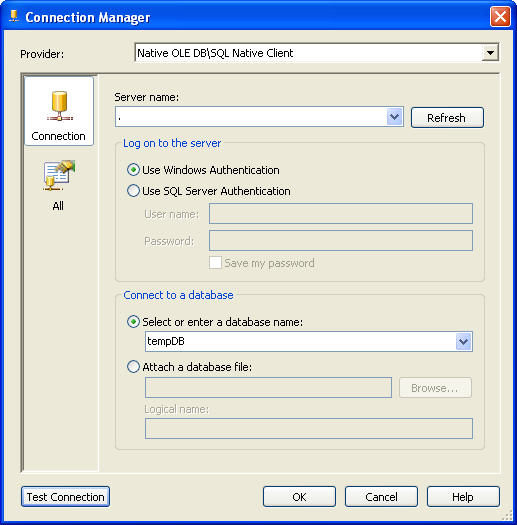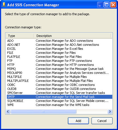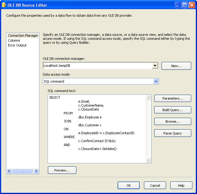 2、建立连接 在这个任务包中,我们将建立2个连接,一个用于获得数据的连接,一个是用于发送邮件的连接 建立连接的过程非常简单,下面这图通过点击 【New OLE DB Connection】 呈现 建立SMTP连接可以通过点击 【New Connection】,然后选择SMTP 呈现
