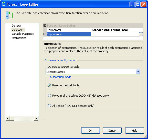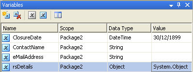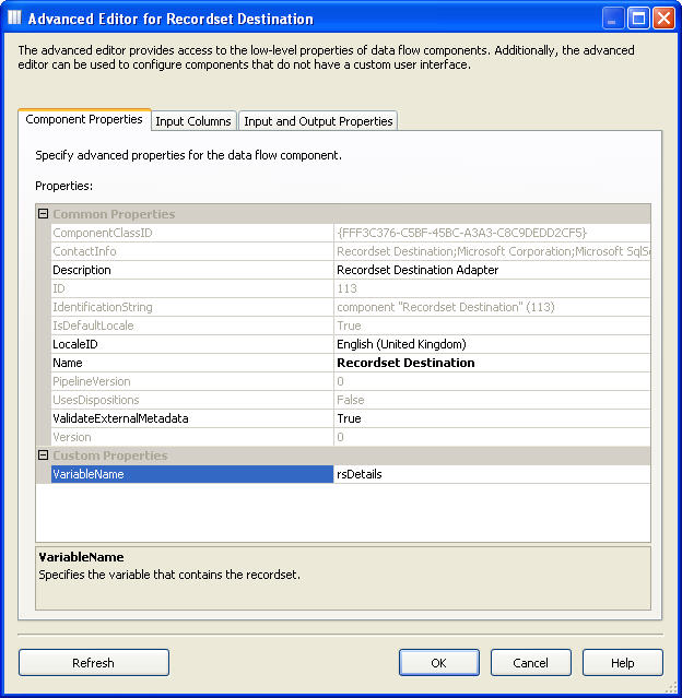 3、数据流任务 我们要想把数据填充到变量中,首先我们要先把数据提取出来 当然,这是很简单的事情,在数据流任务面板拖曳上下面2个组件 OLE DB Source组件 Recordset Destination组件 然后设置OLE DB Source组件的连接信息和数据信息,如图: 然后把OLE DB Source组件和 Recordset Destination组件连接起来,设置Recordset Destination组件的属性 当然,我们想把记录保存在变量中,可以通过设置Recordset Destination组件的属性即可 如图,我们把从OLE DB Source组件流出的数据保存在了rsDetails变量中 好了,完成上面的设置后我们的数据流任务面板看起来就像这样