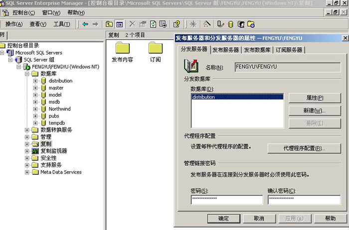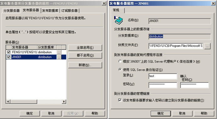 在新建的JIN001发布服务器上建立和分发服务器FENGYU/FENGYU的链接的时需要输入distributor_admin用户的密码