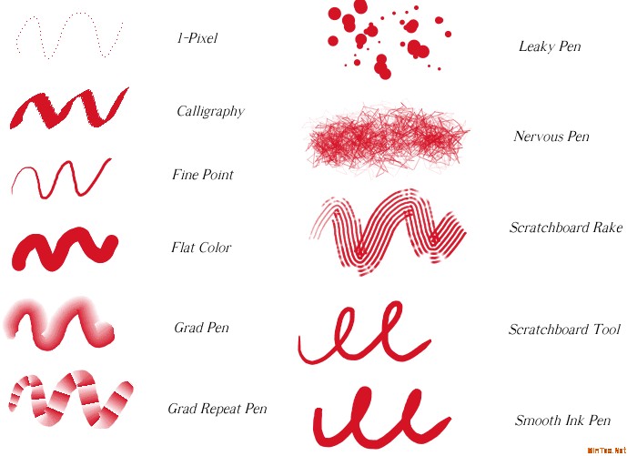 2,Pens: 沾手筆或鋼筆 沾水筆最適合描線,是畫漫畫人的最愛,不過傳統的沾水筆用起來不但麻煩,不會用的人還容易劃破或弄髒紙張,在Painter里就完全沒有這些困擾了。鋼筆其實就是多了墨水管的沾水筆,所以在Painter里這兩者是一樣的。沾水筆一般都不會產生紙紋的,所以不只線條漂亮乾淨,也適合漫畫、卡通的著色。 1-Pixel:像素畫筆,線條永遠是由一個個像素 (pixel) 構成,調整Size只會改變點與點之間的距離,而不會改變點的大小。 Calligraphy:書法筆,這當然不是中國的書法,而是西方文字那種有粗有細的書法,這是唯一會產生紙紋的沾水筆。 Fine Point:針筆,筆尖細而圓,非常適合描線。 Flat Color:平塗色筆,平塗顏色用,不會留下紙紋或任何塗抹的痕跡。 Grad Pen:漸層筆,配合Art Materials的gradients使用,可以讓筆觸有漸層效果。 Grad Repeat Pen:重複漸層筆。這兩支筆用在美術設計的機會比較多,應該沒人用他們來手繪吧? Leaky Pen:漏水筆,初學沾水筆的人最討厭的困擾就是筆尖漏水,同樣的效果在Painter里卻得靠這支筆來達成。 Nervous Pen:纖維筆,畫出一些淩亂的線條,交織在一起就有纖維的感覺。 Scratchboard Rake:耙筆,可以“耙”出一整排的平行線,相關參數在Brush Controls下的Rake設定,例如平行線的數目。 Scratchboard Tool:塗鴉筆 Smooth Ink Pen:平滑墨水筆,這兩支筆實在很接近,都可以畫出不同粗細的漂亮線條,唯一的差別是最細筆尖的設定,塗鴉筆為0,所以線條收尾收到一點,而平滑墨水筆的收尾不是收到一點,感覺上線條比較粗。 。