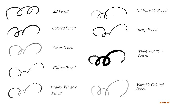 1.Pencils:鉛筆Pencils和Dry Media有許多相似性,例如能夠呈現紙張的紋路,還有線條粗細通常不隨筆尖壓力改變等。除了筆尖粗細不同外,Pencils和Dry Media最明顯的差異在於,如果在同一個地方來回塗抹,一般的鉛筆會讓顏色變得暗沉,而乾筆不會。 在Painter裡鉛筆最主要的用途應該是打草稿吧?2B Pencil(2B鉛筆)和Sharp Pencil(尖銳鉛筆)都很適合用來打稿。而Cover Pencil(圖面鉛筆)適合完稿的描線工作,因為他的線條比較柔和,也適合畫素描。 Flattened Pencil是素描專用的扁形鉛筆,筆芯是扁的,所以同一支筆改變傾斜度和角度(而不是壓力)就可以改變線條的粗細和角度,不過這種功能要Intous以上的壓感筆才支持,廣大的非凡Favo族就只能乾瞪眼了。 Colored Pencil和Variable Colored Pencil都是彩色鉛筆,不過兩者用起來明顯不同,前者有明顯的紙紋,色彩覆蓋性較強,而後者比較像油性筆,紙紋不明顯,色彩較透明,另外也像Flattened Pencil可以有不同粗細,當然這也同樣要Intous以上的壓感筆才支持。Oily Variable Pencil是油性鉛筆,跟Variable Colored Pencil非常接近,只是色彩是不透明的。 Grainy Variable Pencil是粗粒鉛筆,紙紋非常明顯。Thick and Thin Pencil是會隨著壓力改變粗細的筆,也是用在需要明顯紙紋的場合。