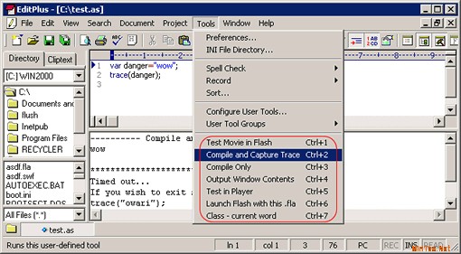 注:使用这两个软件实现输出结果的前提条件是,要保证Flash已经启动并且Output窗口处于开启状态。在Flash里新建一个文件并保存,在第一帧里用include语句包含你正在编辑的文件.例如:#include "your_file.as"