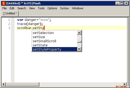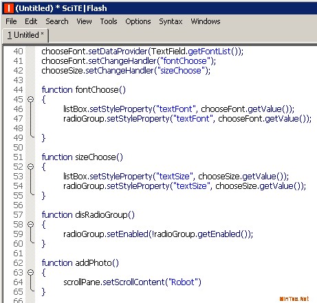 第二个就是SciteFlash,这是目前最流行的AS编辑器.它已经集成了Flush.并且具有Flash MX AS语法高亮显示功能.