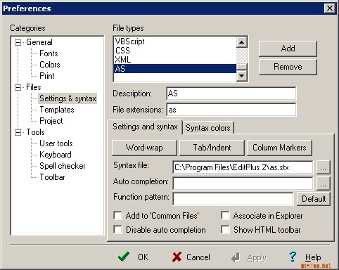 Flush 中包含Flash5的语法高亮显示文件。可以让Editplus高亮显示AS代码,建议大家升级为Flash MX的语法高亮文件这里下载。语法高亮文件设置方法如下图: