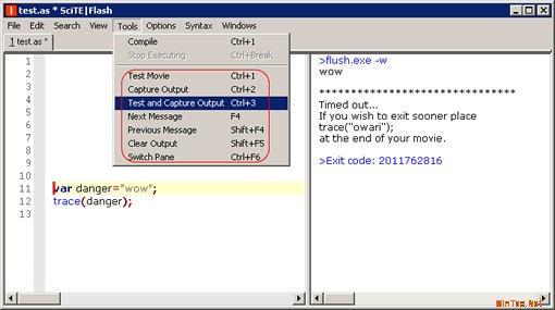 为了便于大家理解,可以下载下面的例子进行练习:trace_danger.rar 解压后,用Flash打开danger.fla文件。剩下的工作就是用EditPlus和SciteFlash打开danger.as进行输出了。(Editplus使用快捷键Ctrl+2,SciteFlash使用Ctrl+3进行输出。)