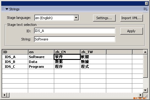 2,当前这个字符串面板,我添加了三种语言(英文,简体,繁体),每一行字符串都有一个唯一的ID用来定位相应的文本框(只支持动态文本框和输入框),如果想删除某一样字符串只要使用Backspace键删除那一行的ID就行了.