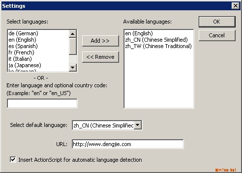3,进入设置(settings)选项,你首先要添加几个你需要的语言,然后选择一个默认语言。如果你不想语言包和该文件在同一个目录下,你可以指定一个包含语言包的URL.
