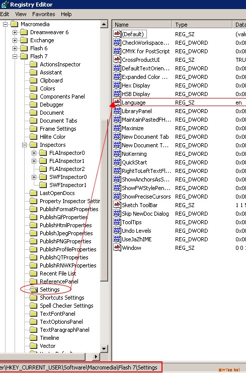 3,情况出现了,有人会问为什么最后安装了中文版,启动后还是英文? 看到下面的注册表了吧.要用什么语言直接改language就可以了. Flash MX 2004会根据你的language设置启动不同的语言版本. (简体|zh_cn,繁体|zh_tw,英文|en) 我的方法是将注册表设置导出来,如图二所示.要用什么语言直接点注册就行了