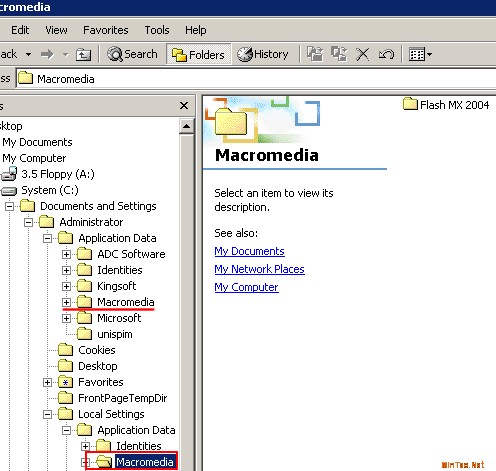 4,最后我想说一下F04的用户配置文件目录,F04是MX 2004系列中最特殊的一个. 他的配置文件没有和DW,FW放在一个目录,而是独自占块地盘. 框出来的地方就是F04配置文件所在地,下划线是DW2004,FW2004的配置文件的位置 你在Flash MX 2004中的配置和安装的所有插件都会在这个配置文件夹中找到.