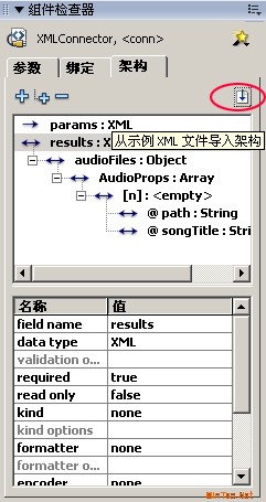 3.点击场景上的Xmlconnector组件,命名为conn,在属性面板中设置如图(1)