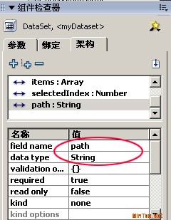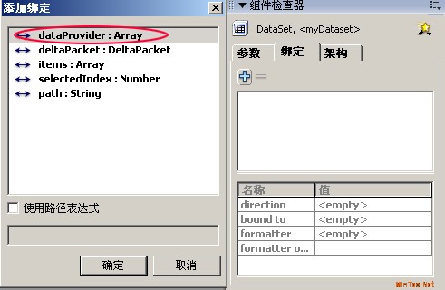 7.选中Dataset组件,命名myDataset, 在组件检查器中点击绑定,按"+"号,如图所示,选择dataProvider:Array,按确定