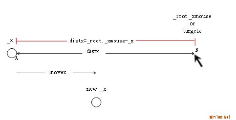 在这里我们使用了 _x+=movex; _y+=movey; 首先我们得注意,movex和movey并不是一个固定不变的数值,在MC的运动过程中,其x、y坐标是不断变化的,所以movex和movey也是不断变化的(movex=distx/10;movey=disty/10;而distx=targetx-_x;disty=targety-_y;)。 你可以看看下面这张图(x方向)以帮助理解。