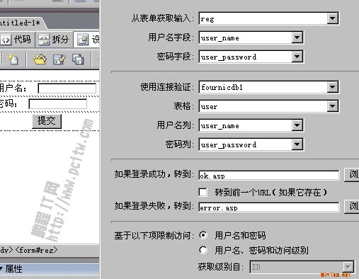 首先声明,登陆用户服务器行为仅仅是生成代码,不能构造相关页面。而我们在这里主要是解析 Dreamweaver 生成代码的含义,以便大家灵活的应用。凡是学过 asp 的朋友都清楚,用户的验证也就是到用户表内查询指定的用户名和密码,如果找到,则代表可以登陆,否则即为错误。而权限方面主要是应用 Session 变量或 Cookies ,Dreamweaver 也是如此。但 Dreamweaver 为我们自动的提供了2个 Session ,也就是"用户名"和"密码"。而至于权限级别也得用到指定的数据库字段。而在实际应用中,仅仅应用2个 Session 是不够的,有可能需要更多的 Session,也就是我们需要修改 Dreamweaver 生成的代码。