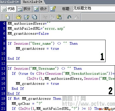 首先说明,[图3]中 矩形1 的范围代码是我手工增加的。先说说 矩形2 部分,这是个判断语句,主要是判断指定的 session 变量是否为空,如果为空则代表是非法用户。如果为合法用户,则将变量 MM_grantAccess 赋值为true(MM_grantAccess 默认为 false)经过判断后,在代码的第 19 行开始判断 MM_grantAccess 变量。我们的目的就是修改 Dreamweaver 生成的代码,使能够其识别和判断我们的自定义 session 变量。